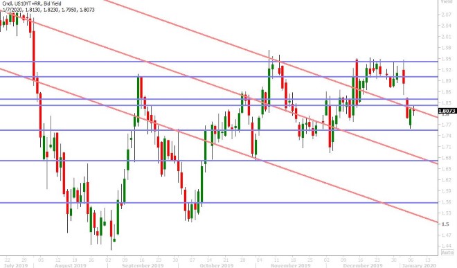 Yesterday’s “seller failure below 108” was enough to propel USDJPY higher for the rest of the NY session, however the market has since run into stubborn chart resistance in the 108.40s and a US 10yr bond yield that has not yet given up the prospects of a new downtrend. We think this is because traders got reminded once again overnight that Iran is still quite ticked off with the killing of its legendary military commander. Ali Shamkhani, head of Iran’s security council, said that Iran is evaluating 13 possible ways to inflict a “historic nightmare” on the US. More here from Bloomberg. So while one could argue fears of World War III have receded since Sunday night, we think there’s still plenty of angst in the marketplace and this explains why the bounce in US yields and USDJPY has been rather tepid.