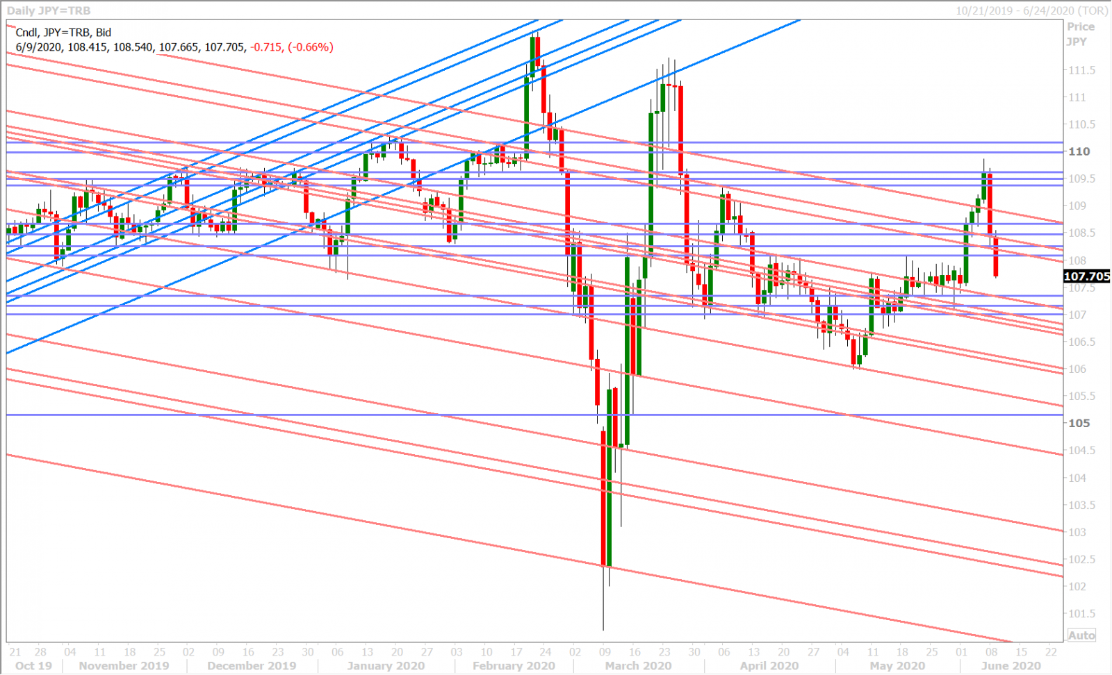 Dollar/yen collapsed lower with US yields yesterday as bond traders continued to hedge the possibility of yield curve control from the Fed, and it’s showing close correlation with broader risk sentiment this morning as the markets digest China’s warning to its students about studying in Australia. Former chart support (now turned resistance) in the 108.10-20s has proved formidable for USDJPY to surpass ever since last night’s higher than expected USDCNY fix knocked the market below it.