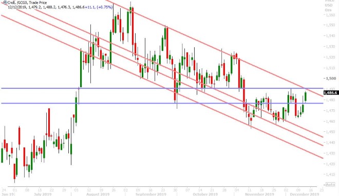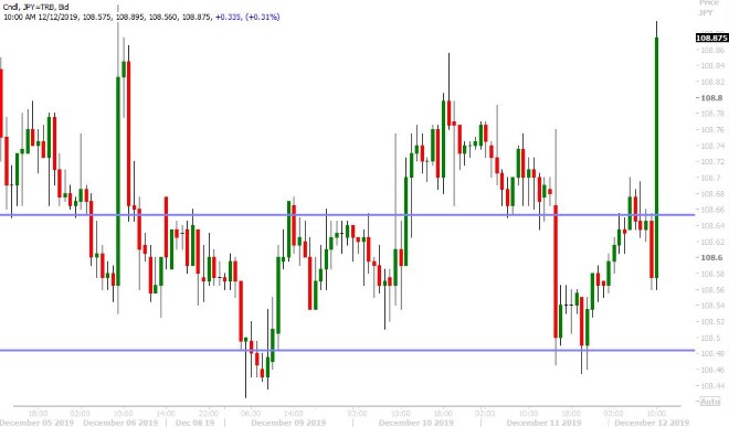 The dollar/yen fund longs got dealt another blow yesterday following the FOMC meeting, but they’ve managed to hang on to 108.50 chart support during the overnight session despite some UK-election related “risk-off” flows. The US 10yr yield has just reversed back above the 1.80% as German bund yields spike 3bp higher. This is likely ECB-press conference driven as Christine Lagarde continues to speak. We continue to believe the funds (who have been buying USDJPY for weeks) are not well positioned here for “risk-off” headlines heading into week’s end. We have the UK election results coming up during the Asia session tonight, and then of course the looming Dec 15th tariff deadline.