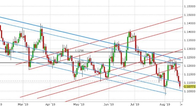 Euro/dollar fell apart during NY trade yesterday (following our bearish technical outlook) and all it took was some more dovish comments from ECB board member Olli Rehn. More here from the WSJ. The German bund yield fell below -0.70% to a new record low on the headlines, and we’re trending lower again today (-0.72%). This continues to drag EURUSD lower in our opinion, and with trend-line support at the 1.1100 level now gone, we think the market risks slipping into the 1.1050s. The better risk tone to markets this morning is pulling December gold prices back below new trend-line support in the mid-1520s, and we think any further selling here of the precious metal could hurt EURUSD as well (given recent correlations since the US/China trade war escalation last week).