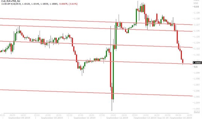 Euro/dollar started the week on a quiet note, despite gold’s 1% pop higher at the 6pmET futures open last night, and we’re now seeing some technical selling come in after Friday’s disappointing NY close (no real follow-though from Thursday’s bullish outside day reversal). It’s also about that time where EURUSD traders start positioning themselves for this week’s highly anticipated Fed interest rate decision on Wednesday and we get the sense they’re bracing for a less dovish than expected 25bp cut from Jerome Powell (maybe this is the last cut?). Germany will report its September ZEW survey tomorrow morning at 5amET. EURUSD is now trading within Thursday’s very wide price range, which we think could make it vulnerable to a decline all the back to the 1.1000 level. The ECB’s chief economist Lane is currently speaking, but we have yet to hear anything market moving. The ECB’s Lautenschlager will be speaking at 12pmET today.