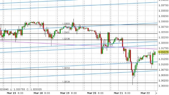 EURUSD: Euro/dollar is hemorrhaging losses this morning as the 44.7 (vs 48.0 expected) read on German manufacturing sentiment for March is starting to confirm some of market’s worst fears about slowing global growth. EURUSD plunged all the way down to the next major trend-line support level in the 1.1290-1.1305 area, and this comes after an already poor NY close yesterday which saw the market retrace all of Wednesday’s post Fed gains. German bund yields are tanking, and have now gone below zero! We think the leveraged funds (who are net short EUR) are breathing a sigh of relief over the last 48hrs. We’ll get an updated read on their positioning from the CFTC later today.