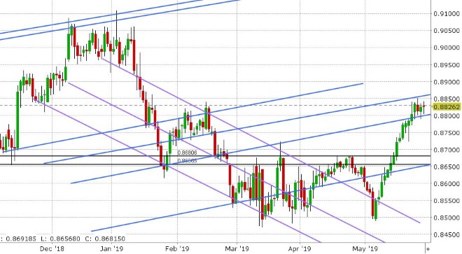 Dollar/CAD is trading with a mixed tone this morning as US traders return from the Memorial Day long weekend. A mild wave of selling in European equities and the S&P futures earlier this morning has helped the USD more broadly, but there hasn’t been a whole lot of momentum behind the move and USDCAD is now hitting familiar trend-line resistance in the 1.3470s. This week’s calendar features the Bank of Canada interest rate decision tomorrow, where no change is expected. While we think Stephen Poloz will acknowledge the recent improvement in Canadian data (record employment report for April, higher than expected core CPI for April, better than expected Retail Sales for March), we think he’ll continue to express concern over global trade uncertainty and oil prices (both of which have deteriorated since the April meeting). Thursday’s session will bring the 2nd look at US GDP for Q1, along with a speech from the Bank of Canada’s deputy governor Wilkins. Finally, on Friday we’ll get the US PCE Index (April), Canadian GDP (April), Canadian Raw Material Price Index (April) and the Chicago PMI (May). The leveraged funds continue to hold a net long position in USDCAD, but they have trimmed long positions as of May 21.